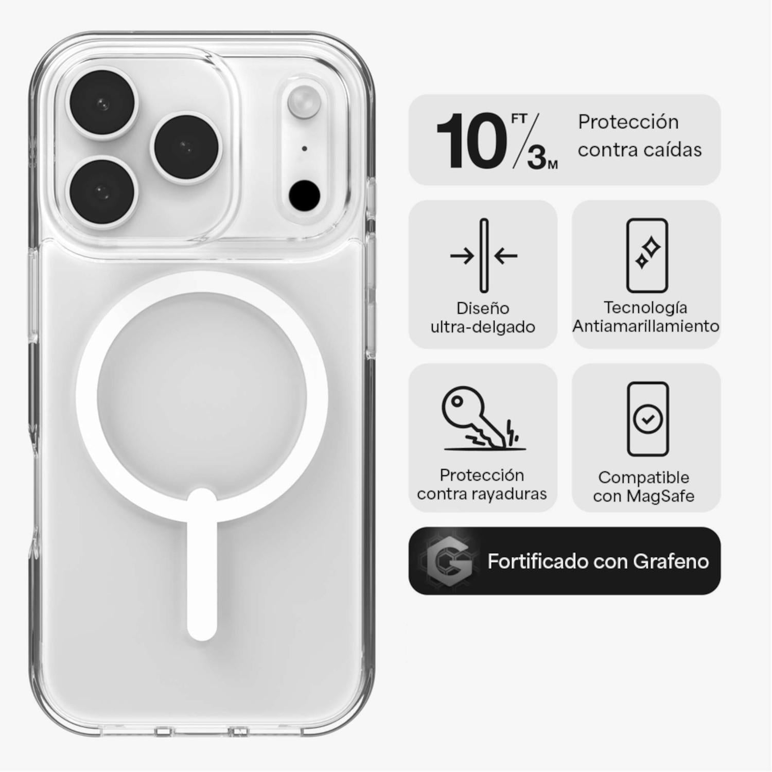 Cuenta con tecnología anti amarillamiento que mantiene la funda (y tu teléfono) impecables. Su diseño ligero y estilizado no añade peso innecesario. Y, por supuesto, es compatible con MagSafe.