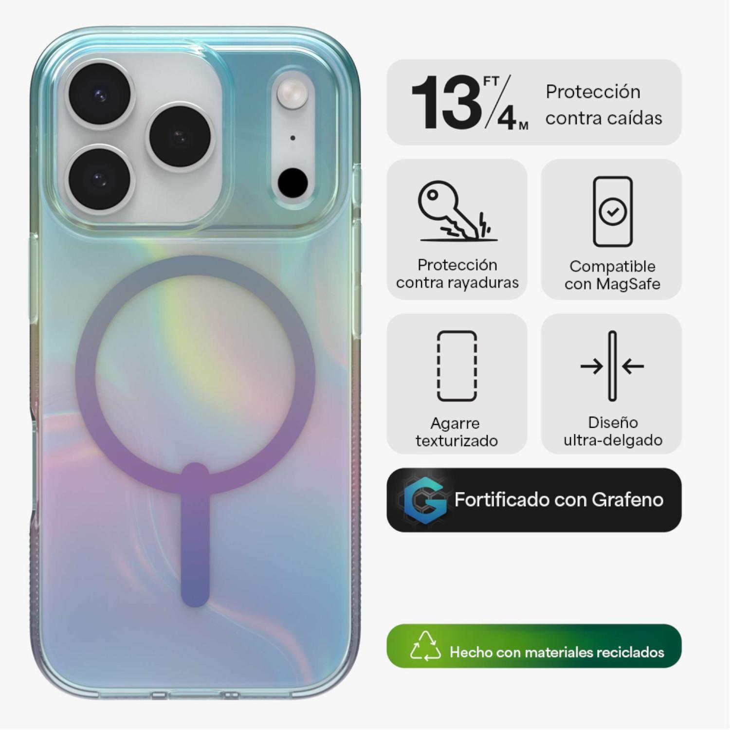 Inspirado en los intrincados tonos y formas de la naturaleza, el Milan Snap Burbuja Iridiscente combina con solidez el estilo urbano y la protección. Y es mucho más que una simple funda bonita. Milan Snap está diseñado para ser duradero y protege tu teléfono de caídas de hasta 4 metros de altura.