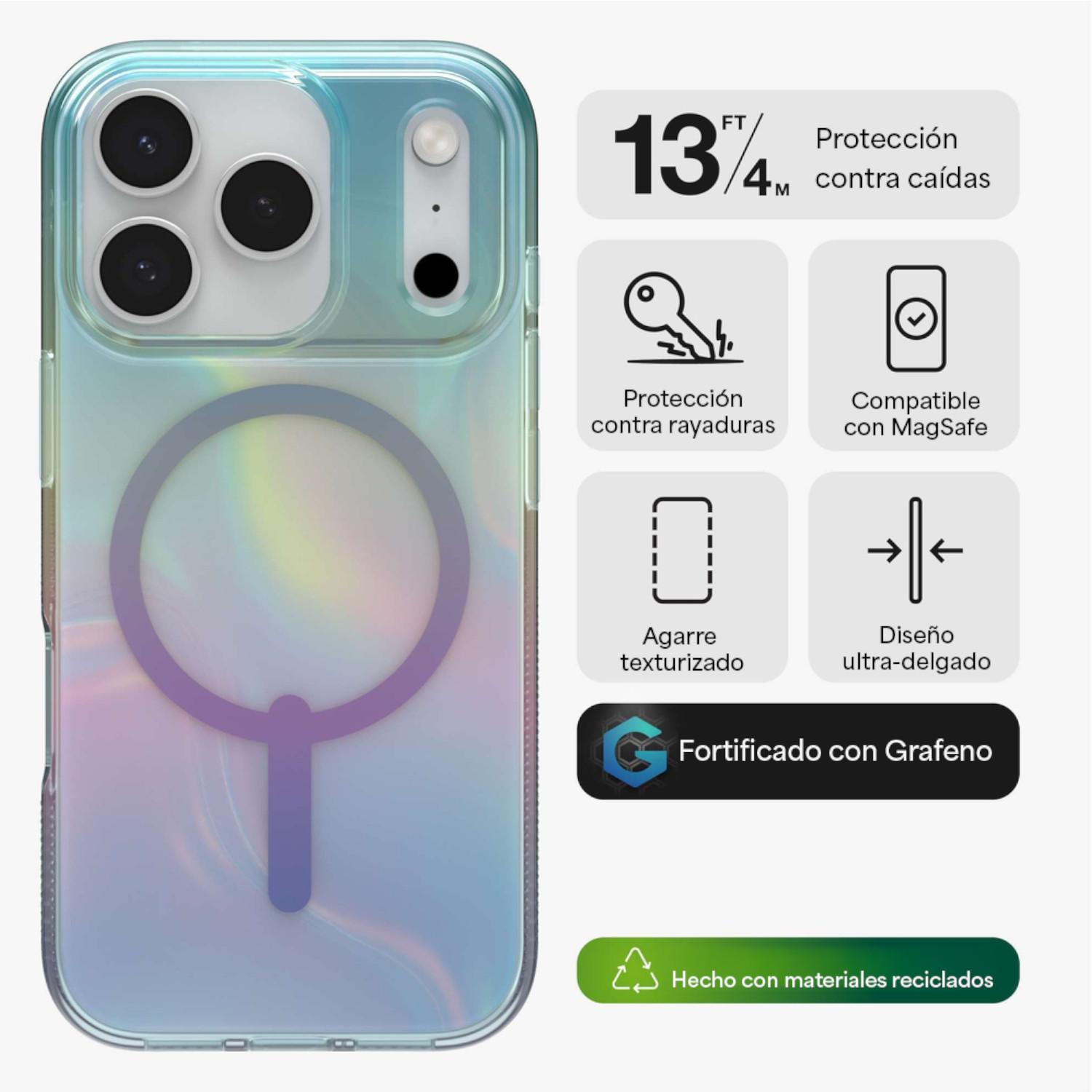 Inspirado en los intrincados tonos y formas de la naturaleza, el Milan Snap Burbuja Iridiscente combina con solidez el estilo urbano y la protección. Y es mucho más que una simple funda bonita. Milan Snap está diseñado para ser duradero y protege tu teléfono de caídas de hasta 4 metros de altura.