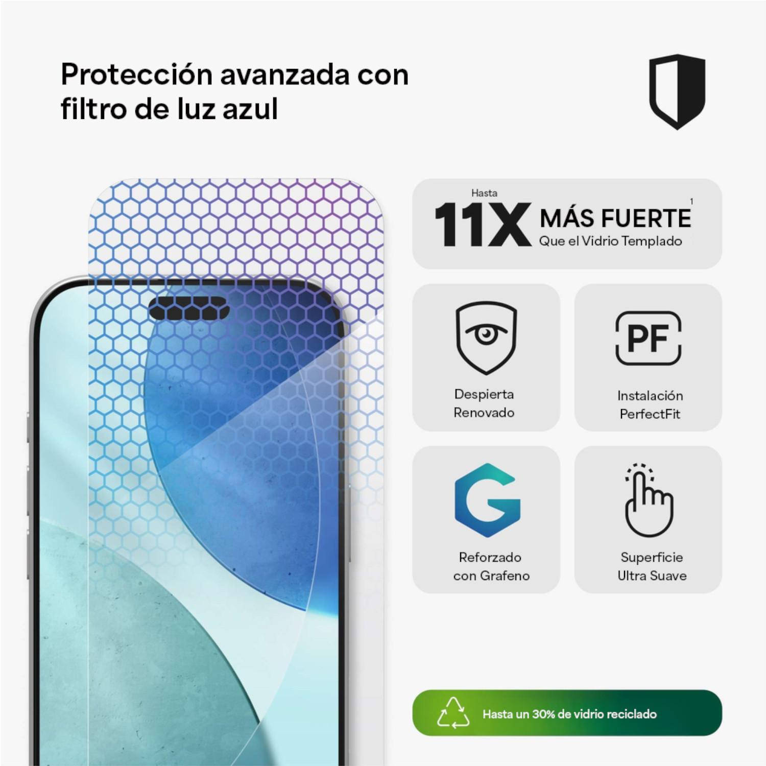 Proporciona una protección perfecta de borde a borde con la tecnología Eyesafe RPF60 para filtrar la luz azul (435-440 nm).