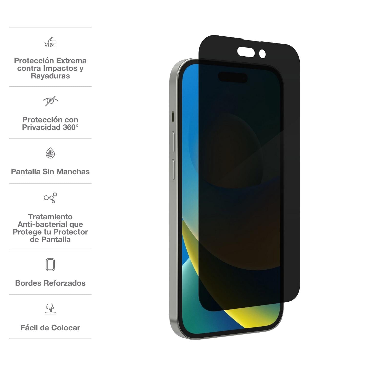 Vidrio de aluminosilicato con tratamiento antibacteriano, cinco veces más fuerte que las micas tradicionales. Además, posee un doble filtro de privacidad que impide que terceros vean tu pantalla de ambos lados. Diseñado para iPhone 14 Pro.