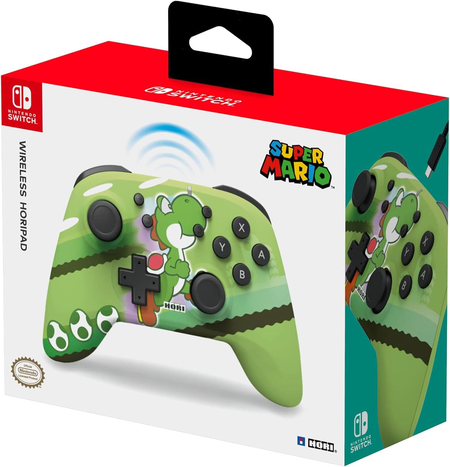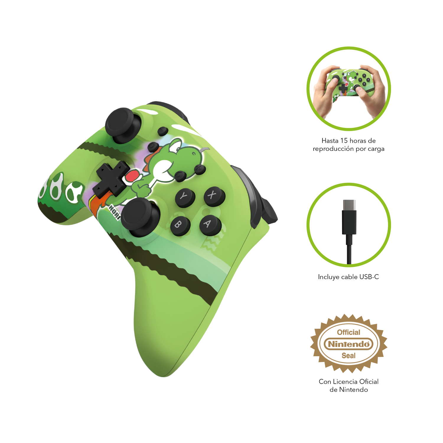 ¡Flutter entra en acción con el amigo de lengua pegajosa de Mario, Yoshi! Presentamos el nuevo HORIPAD inalámbrico Yoshi Nintendo Switch.La batería recargable de iones de litio incorporada y la tecnología inalámbrica Bluetooth le brindan libertad con un alcance de 10 metros y más de 15 horas de duración de la batería. Ligero pero sólido, el HORIPAD inalámbrico ágil y receptivo está equipado con un acelerómetro y giroscopio para un control total del movimiento, lo que lo convierte en la opción preferida para los jugadores de Nintendo Switch.Se carga con el cable USB-C incluido. Con licencia oficial de Nintendo.Características: Control Inalámbrico De Yoshi Verde HoriControlador inalámbrico Bluetooth con alcance de 10 metrosBatería recargable con hasta 24 horas de reproducción por cargaLigero y ergonómicoAcelerómetro y giroscopio para un control de movimiento completoRecarga con cable USB-C (cable USB-C incluido)Con licencia oficial de NintendoNo cuenta con NFC o HD Rumble.